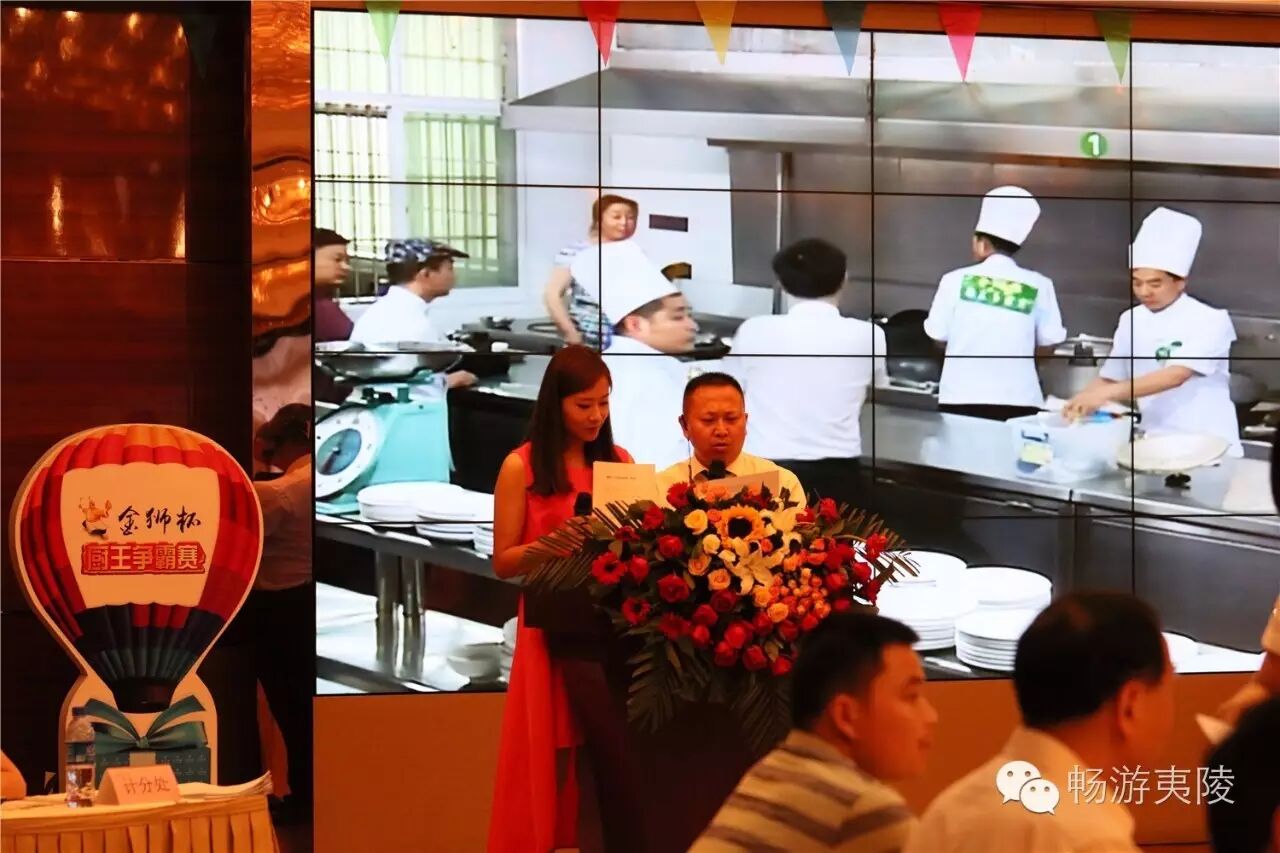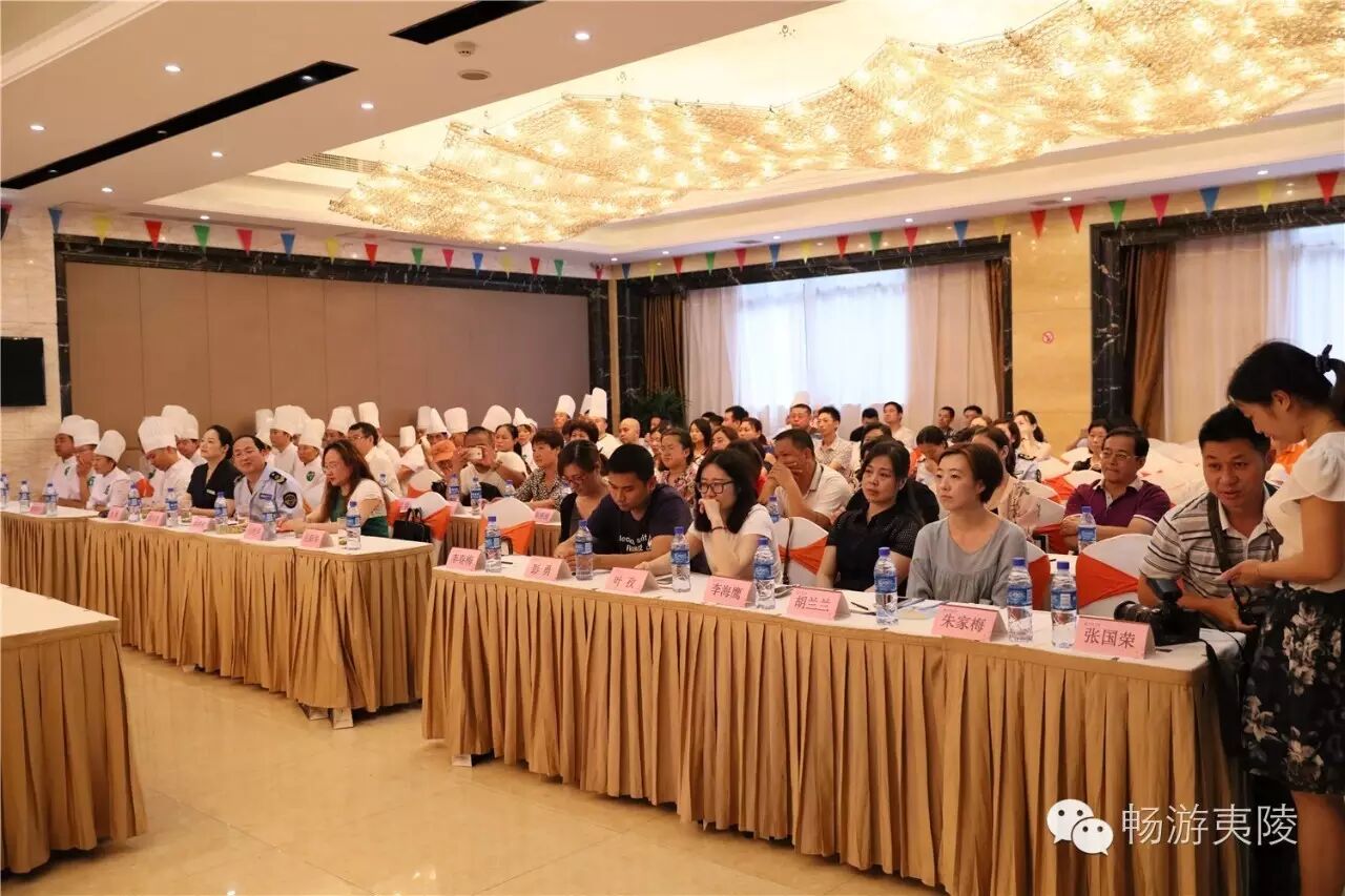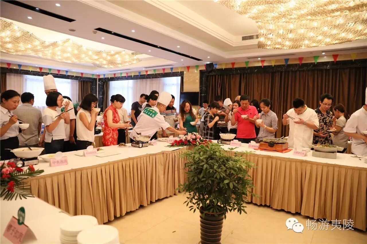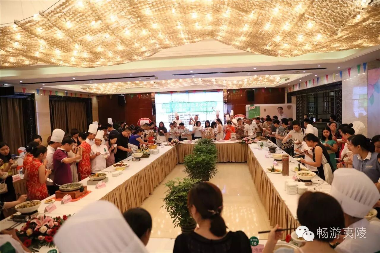 6月15日上午,首届“夷陵十大地方特色菜”现场评选暨“金狮杯”厨王争霸赛在夷陵区金狮宾馆盛大举行,29道“夷陵地方特色菜”惊艳亮相!本次比赛由区旅游局、区食药局、区经信局主办,区旅游协会承办,协办单位为金狮宾馆、夷陵电视台、中国夷陵网。区政协副主席姚维树、区旅游局局长刘艳华、区食药局局长颜尔新、区经信局副局长岳新华、金狮宾馆执行总经理徐静等领导出席本次比赛。7位专家评委、8家媒体评委、22位大众评委、入围本次比赛的30道菜肴(其中4号菜品弃权)的参赛单位代表、厨师、新闻媒体记者、社会人士等200多人共同见证了历史性的时刻。