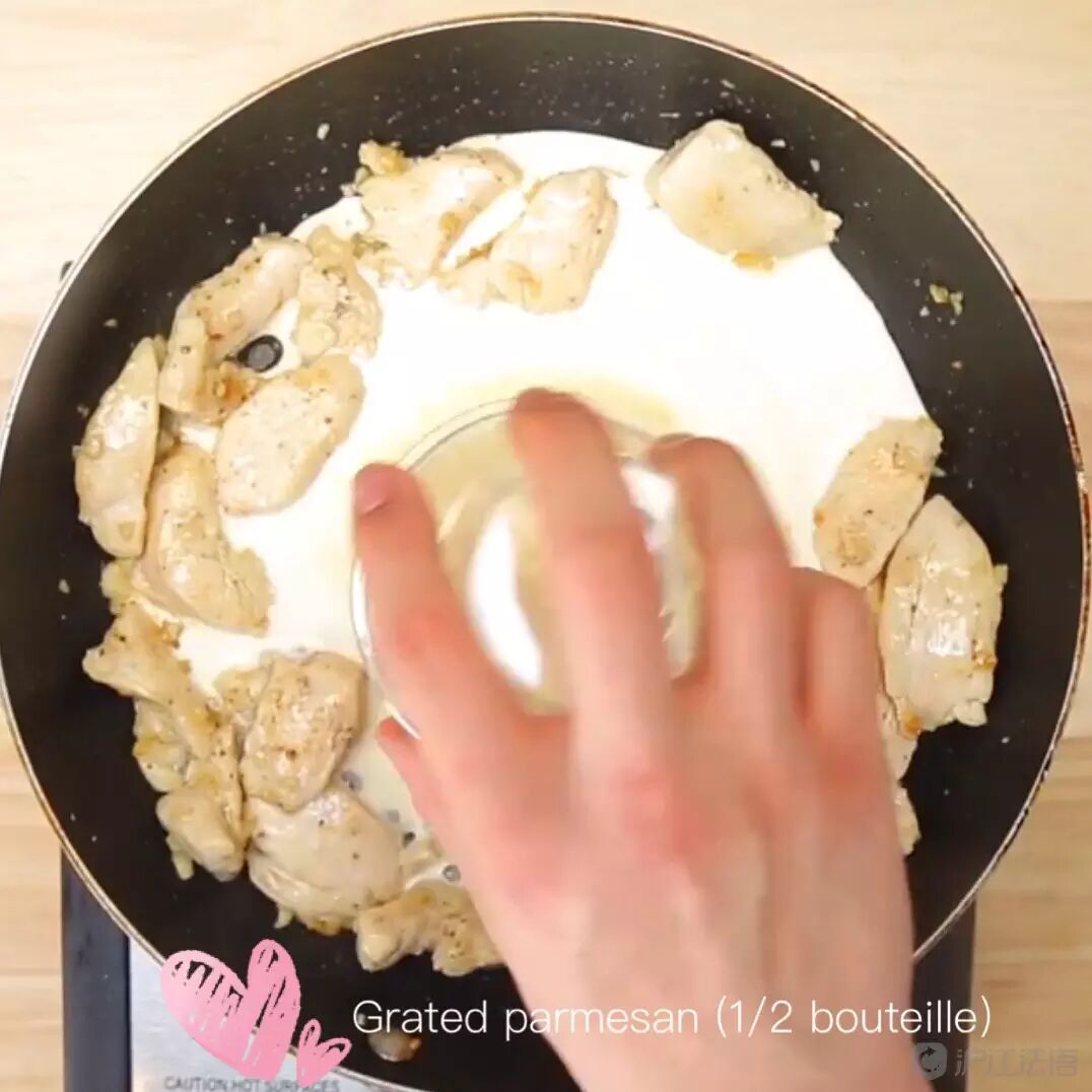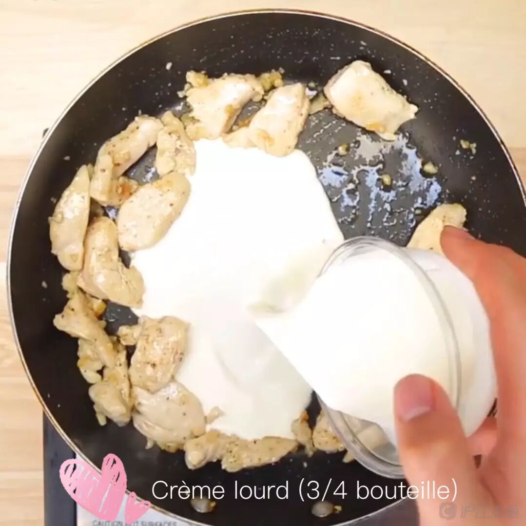 加入高脂奶油、帕玛森干酪(加水使其成为液体)、香蒜沙司,搅拌完全