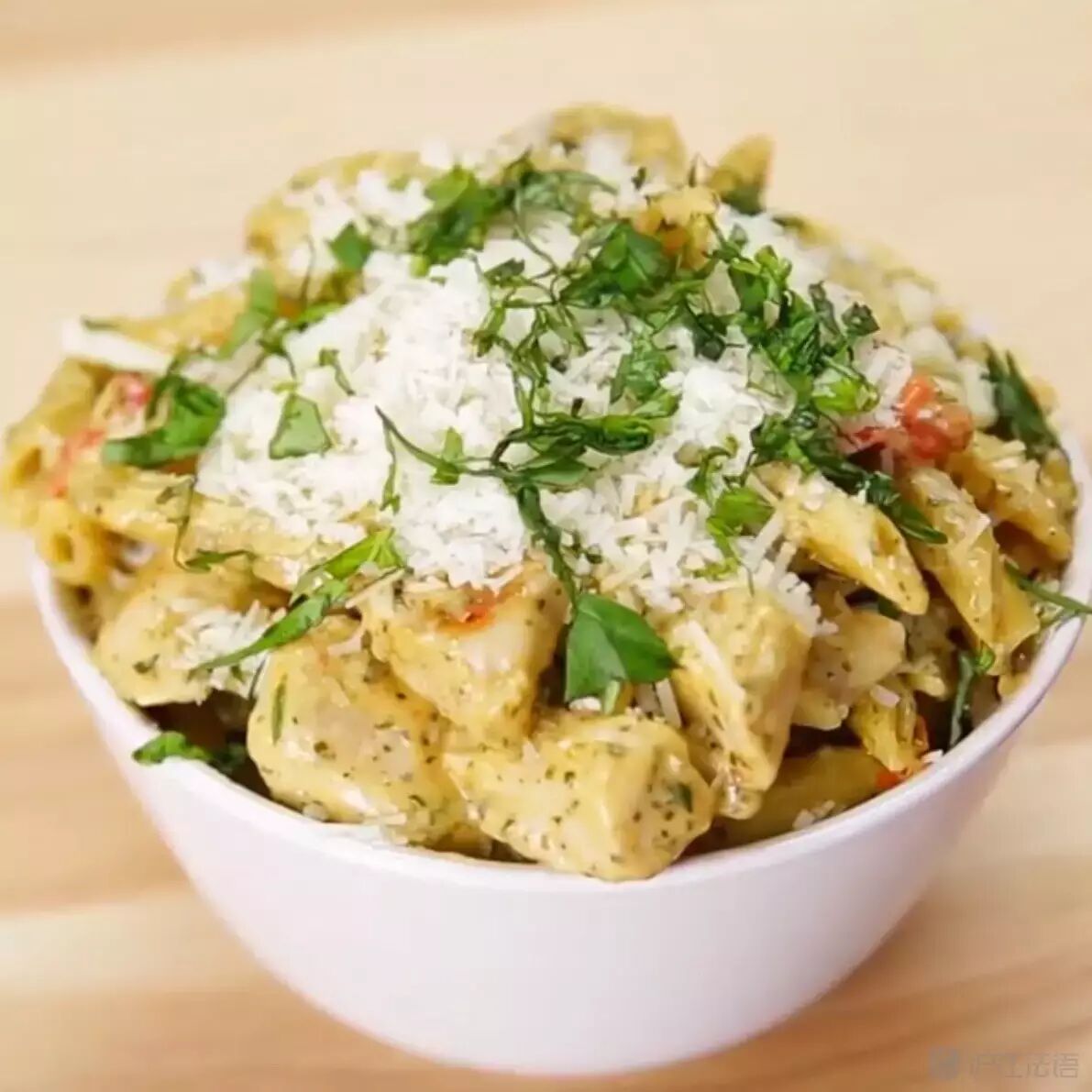装碗,在表面撒上帕玛森干酪和罗勒碎即可食用