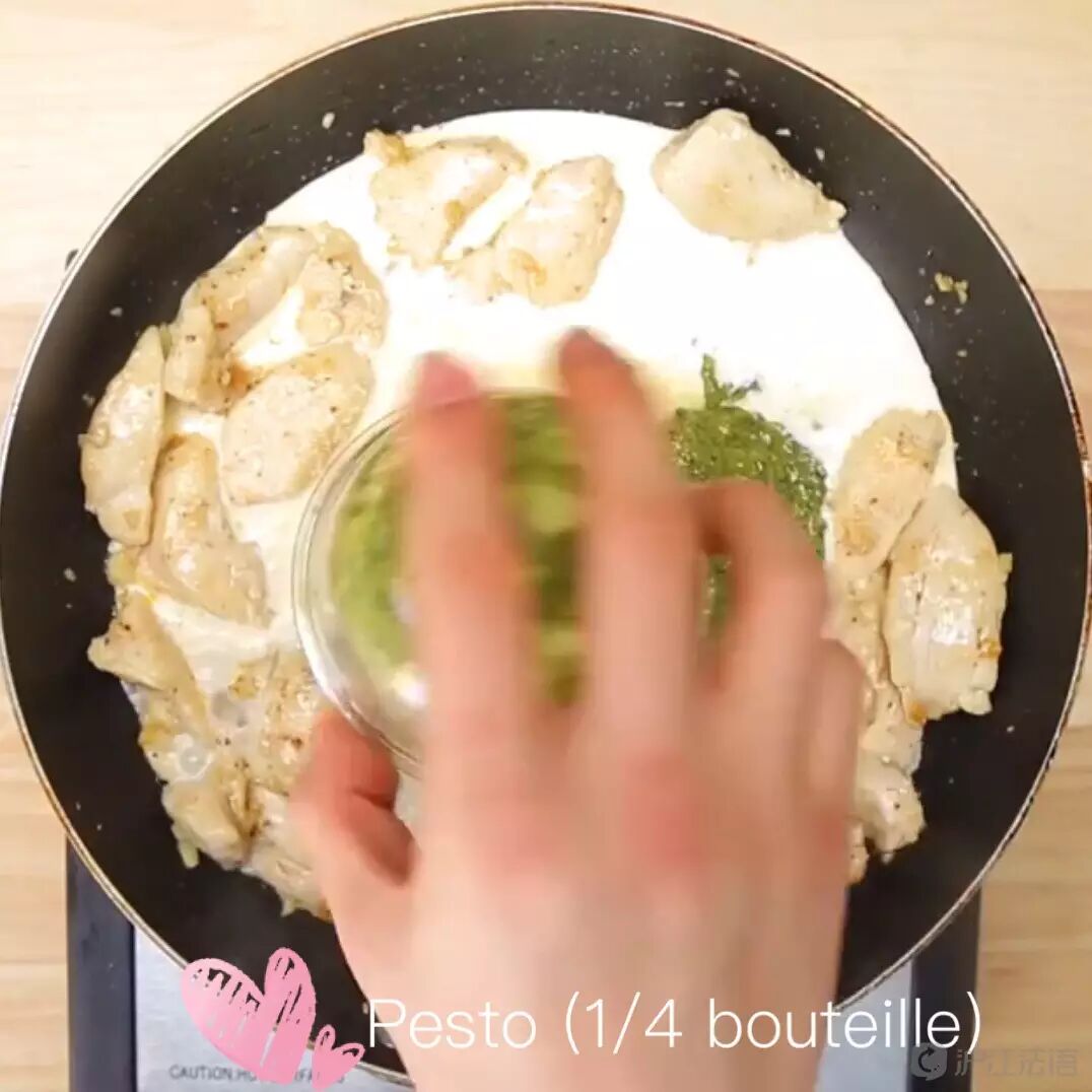 mettre le crème lourd, grated parmesan(avec de l'eau), pesto et les mélanger