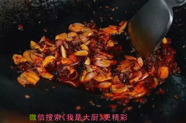 ▲重新中火加热油锅,将豆瓣酱倒入翻炒至变色;