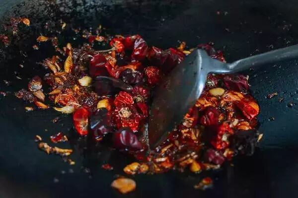 ▲加入干红灯笼椒翻炒;