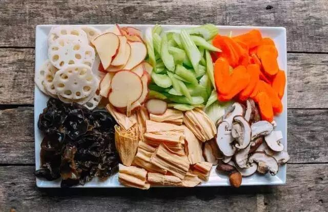 芹菜,胡萝卜,土豆,木耳,腐竹,香菇,莲藕,将这些蔬菜洗净切好,然后将所有的蔬菜再开水里焯到七八分熟(要注意每样菜焯的时间不一样),然后捞出放进冰水里过一下,再然后沥干,备用;(注:你可以替换成任何你喜欢吃的菜,比如豆腐皮,竹笋,红薯片,平菇,五花肉,虾,各种丸子,只是所有的蔬菜都要先开水焯过,所有的肉都要在炒好底料的时候就放进去)