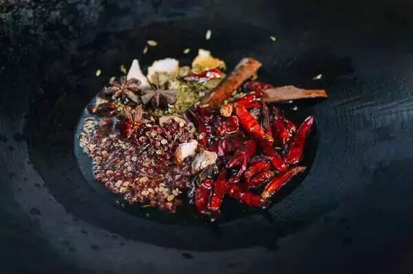 底味料:植物油半杯,3个八角,2勺花椒,1勺茴香种子,1个肉豆蔻,1个肉桂棒,3片月桂叶,1大片陈皮,三四片姜,一把干红辣椒;