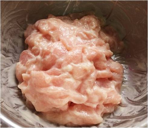 里脊肉洗净,切约2-3mm厚大片,洗去血水。加盐、糖、生抽抓匀,加淀粉抓匀上浆待用;
