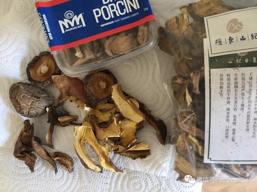 然后把各种干磨菇用温水快速洗一下,再放进小半碗温水里泡着。