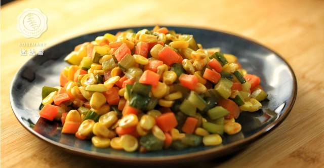 1、胡萝卜、黄瓜去皮切丁;热锅冷油,倒入倒入胡萝卜丁,玉米粒翻炒片刻