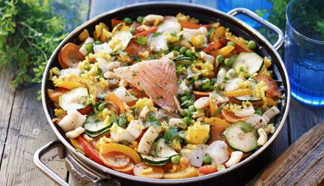 传统的西班牙肉菜饭是在节日时烹制的。人们会筑起柴火,把一个大锅放在在柴火上,先炒香洋葱,然后放入一种类似意大利米、黏性较强、能多吸收水份的arborio rice(西班牙水稻)。把饭炒过后,便会把海鲜放在表面,以上等海鲜汤加以烩制。西班牙肉菜饭的另一特点是会加入番红花(saffron),为饭添上橙橙的颜色。