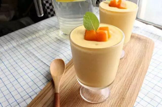 1.芒果果肉100g和牛奶一同用搅拌机打成芒果牛奶;