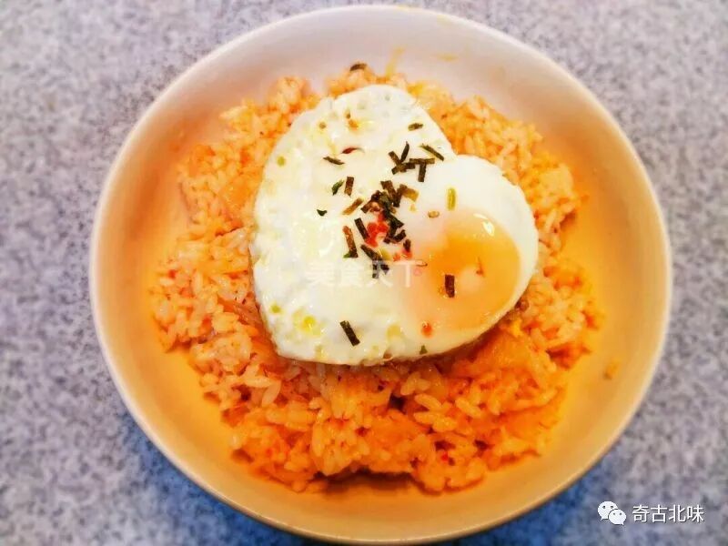 煎蛋煎单面即可,盖到炒饭上撒入海苔碎或白芝麻,吃的时候可以把蛋搅碎拌在饭里