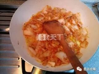 3.炒辣白菜,加入少许香油。炒至没有太多汤汁