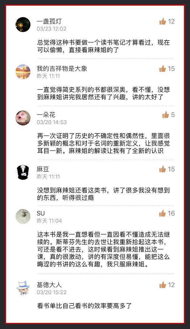 《麻辣姐的书单》第二季——简史系列现已完更,以下为部分学员的评价: