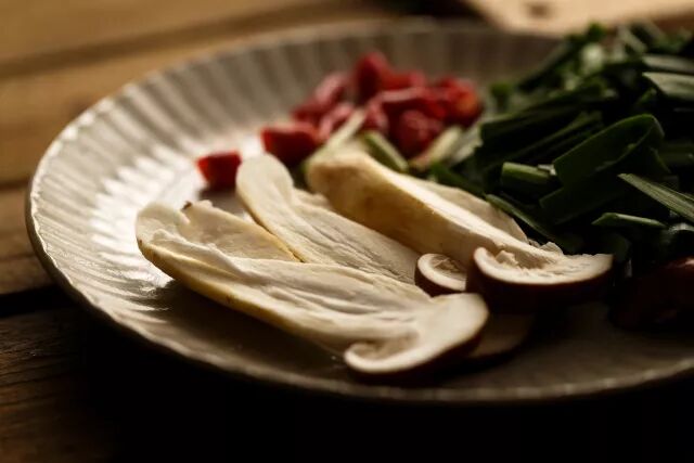 姬松茸,韭菜,小米辣椒,姜,蒜洗干 净切好备用。